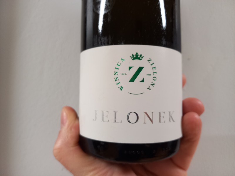 Winnica Zielona Jelonek 2022 (woj. wielkopolskie - gleba piaszczysto-gliniasta, winnica prawie płaska, w pobliżu Jeziora Jaroszewskiego. Maceracja przez kilkanaście godzin, 3 miesiące na osadzie drożdżowym z battonage).