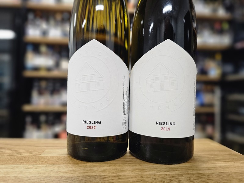 Winnica Turnau Riesling 2022 vs 2019 (woj. zachodniopomorskie, gleba piaszczysto-gliniasta i gliniasta z elementami kamiennymi polodowcowymi, winnica lekko pofałdowana (nachylenie 2-8%), krzewy sadzone w 2010. Fermentacja w stali, dojrzewanie na osadzie 10 miesięcy w kadzi 4800-litrowej z dębu slawońskiego).