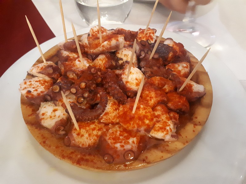 Albariño, obok Verdejo i Cava, jest najbardziej "tapasowym" hiszpańskim winem. Dzięki soczystości, kwasowości i morskiej werwie, wina zbudowane na Albariño zdają się być wymarzonym partnerem do ryb i owoców morza. Najbardziej klasycznym połączeniem jest zestawienie z ośmiornicą, a dokładniej przygotowaną po galicyjsku "pulpo a la gallega" (zwana też pulpo a feira). Ośmiornica jest gotowana w miedzianym garnku, pokrojona na małe kawałki i podana z oliwą, solą morską i wędzoną papryką. Wiele spodziewałem się po tym połączeniu, jak na klasykę przystało. Było dobrze, ale daleko od euforycznych doznań. Struktura wina podążała za cielistością ośmiornicy i kwasowość wina dodawała soczystości potrawie.