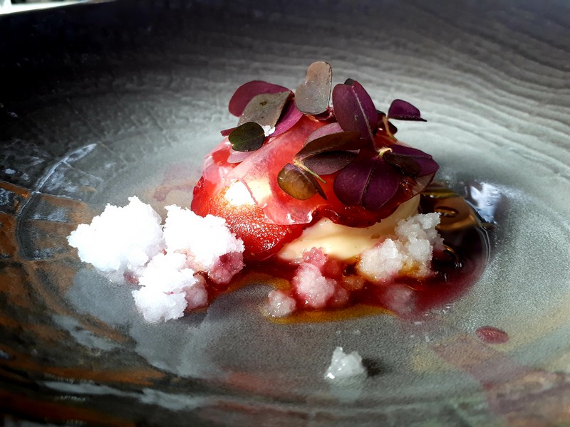 Wina słodkie w tym roku pokazały się z najlepszej strony. Mnie najbardziej zauroczył Solaris z Winnicy Jakubów. Bardzo późny zbiór, udział botrytis i ostatecznie w winie 200g cukru i ponad 8g kwasowości. Jeszcze młode, ale ma przed sobą piękne życie. Słodycz jest duża, ale nie paraliżuje. Wino jest wciąż soczyste i na swój sposób lekkie. Deser przygotowany przez Jakuba Hamankiewicza był jak szyty na miarę dla takiego wina. Słodkiemu Creme patissiere towarzyszył kwasowy rabarbar i słodko-kwaśna truskawka. Wysoka słodycz wina obniżyła się po zetknięciu z deserem, pojawiła się większa kremowość, a bądź co bądź wysoka kwasowość przykryta pierwotnie cukrem, uwydatniła się przy kontakcie z rabarbarem. Poezja zmysłów.