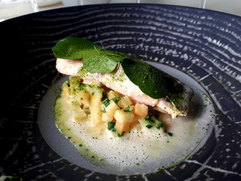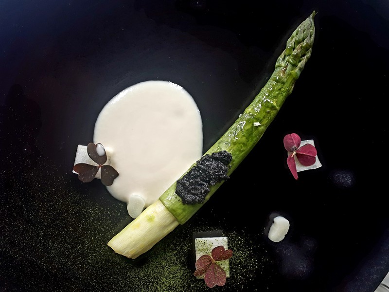Bardzo ciekawy set i wszystkie wina przynajmniej dobre. Szczególną moją uwagę zwróciły Passage z Winnicy Equus oraz Lasy Roztocza z Dworu Sanna. Passage to cuvee Chardonnay i Solarisa, które nie było beczkowane, ale dojrzewało na osadzie. Jest złożone, pikantne z przyjemną, dobrze zaznaczoną kwasowością. W ustach dojrzała cytryna, pomelo, ale też niuanse tropikalne i drożdżowe. Przyjemny rozwój wina, jestem ciekaw jak się pokaże ten rocznik za rok-dwa lata. W winie Lasy Roztocza doceniłem głównie elegancję, równowagę i granie na niuansach. Dobrze wybrzmiało pomimo wzięcia w kleszcze przez intensywny Souvignier Gris od Kojderów i bardzo aromatyczny Hibernal od Michała Pajdosza. Klasa. Jeśli chodzi o potrawę to łatwo nie było. Zielony szparag z veloute z białych szparagów, konfitowanym białym szparagiem oraz kruszonką z czarnego chleba i czarnuszki. W kompozycji były też kwiaty. Wbrew opiniom innych komentujących, najbardziej pasowała mi do tego Lauda z Winnicy Miłosz. Fakt, miała cukier resztkowy, ale też bardzo dobrą kwasowość i sporo zielonych oraz kwiatowych akcentów komponujących się ze szparagiem (i kwiatami).