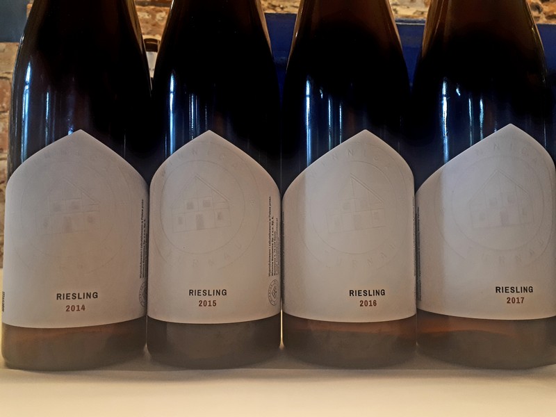 Riesling z 2014 jest już w swoim szczycie, a nawet już delikatnie po nim. Świadczy o tym spora warzywność i niedostatek owocu. 2015 jest najbardziej mocarny wśród nich. Owoc jest słodki, uzupełniony słodkimi aromatami trzeciorzędowymi - miodem, woskiem i petrolem. 2016 zaskakuje powściągliwością owocu i intensywności. Pięknie wybrzmiewa tu mineralność. 2017 z kolei jest tropikalny, egzotyczny i wykazuje początek pięknej ewolucji.