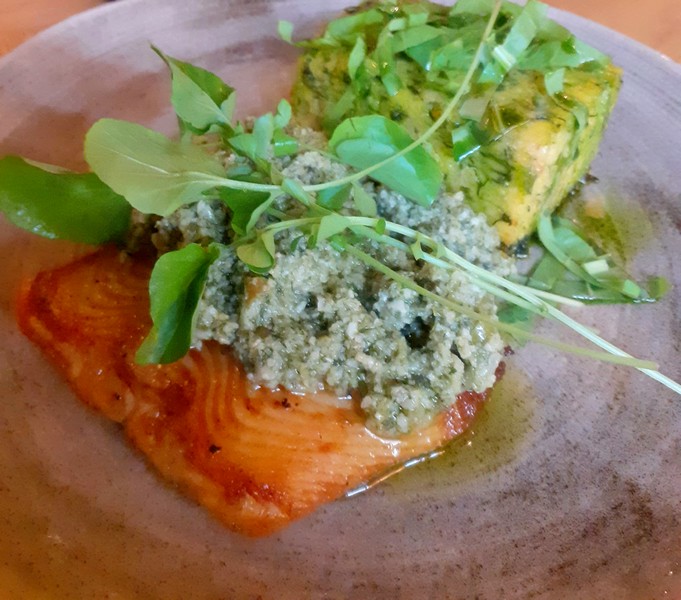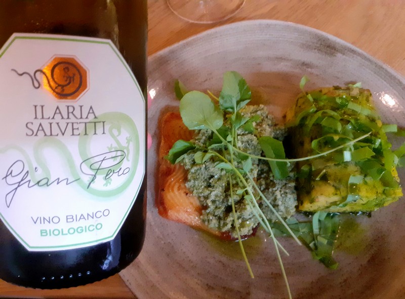 Fromażeria poza dużą selekcją serów, oferuje menu a'la carte. Obsługa profesjonalnie opowiada o potrawach, rekomenduje wina, więc z przyjemnością dałem się poprowadzić. Zdecydowałem się na halibuta (akurat jedno z dań bez udziału sera). Smażony filet ryby, wykończony masłem, podany z pieczoną polentą z dodatkiem ziół. Wszystko to podane ze swieżą rukwią wodną i szczawiem. Na halibucie znalazło się przepyszne pesto z jabłek Granny Smith i pestek dyni. Rekomendowane wino, Ilaria Salvetti "Gian Pero" 2018, oparte o szczep Erbaluce, było niezwykle soczyste z olbrzymią dawką esencjonalnego jabłka, z niuansami ziołowo-kwiatowymi. Podkreśliło jędrność ryby i w doskonały sposób współgrało z jabłkowo-dyniowym pesto. Fantastyczne doznanie.