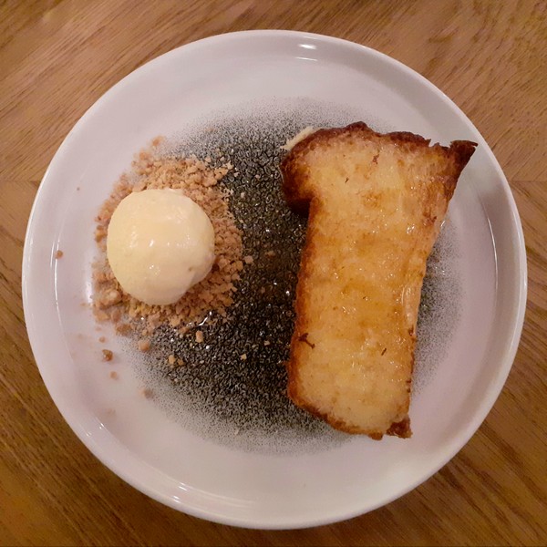 Po serowej rozpuście, zdecydowaliśmy się jeszcze na desery. To była bardzo dobra decyzja, ponieważ to co dostaliśmy, doskonale uzupełniło wieczór. Pierwszym deserem była maślana brioszka (moczona wcześniej w mleku kokosowym), następnie smażona, podana z lodami z beurre noissette, robionymi na bazie kremu angielskiego. Posypane orzechami ziemnymi w cukrze i polane miodem. Umiarkowanie słodki deser, o wyraźnie drożdżowym charakterze. Bardzo dobre połączenie z Harslevelu Late Harvest. Ideałem byłby dojrzały, drożdżowy Champagne Demi-Sec (a nawet Sec).