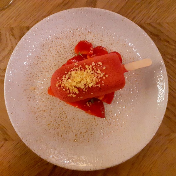 Drugim deserem były lody na patyku. Jednak nie byle jakie, bo na bazie sera Brillat Savarin IGP. Wewnątrz deseru, znalazł się również żelek z mango, a całość została zamknięta w truskawkowej polewie. Wszystko podane na carpaccio z truskawek z dodatkiem listków świężego tymianku. Proponowany pairing w postaci musującego, lekko słodkiego, różowego Moscato Manzoni był perfekcyjny!