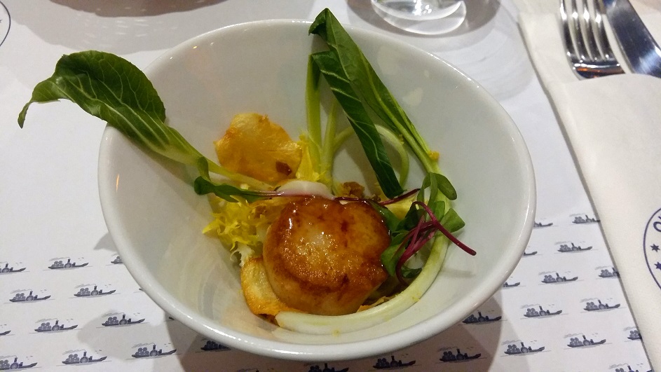 Za dobrze skrojoną kartą win idzie interesująca oferta kulinarna. Miałem okazję spróbować kilku rzeczy. Na początek zostałem zaskoczony dość obfitym amouse-bouche. Idealnie przyrządzony przegrzebek w azjatyckich klimatach sprawił niesamowitą frajdę. Towarzyszył mu sos kokosowy, kruszonka z curry, chipsy z topinambura oraz pak choi. Całość soczysta i delikatnie słodkawa - pycha.