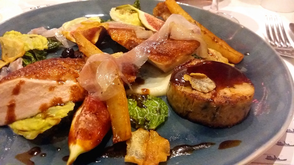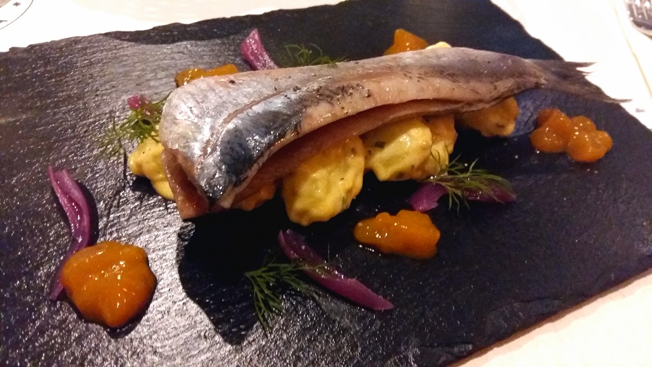 Na przystawkę zamówiłem holenderskiego matjasa na puree ziemniaczanym. Całość została wzbogacona chutney'em gruszkowym. Matjas był soute, delikatny, świeżo wyciągnięty z zalewy. Chutney gruszkowy w miarę wytrawny, z bardzo subtelną słodyczą. Do tej kompozycji świetnie dopasowała się musująca Cava w wersji Brut (6g cukru) Duc de Foix. Jej kwasowość podkreśliła morski smak śledzia, a cukier resztkowy współgrał z gruszkowym chutneyem. Bardzo udany pairing.