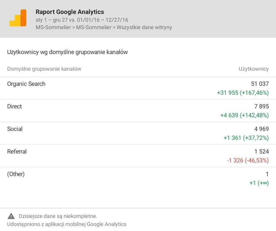Strona www.ms-sommelier.pl rozwija się bardzo obiecująco, szczególnie od momentu gdy skupiłem się na własnej działalności, stronę miesięcznie odwiedza ponad 10 tysięcy użytkowników (UU). Pojawią się pewnie głosy, że to dzięki sponsorowanym postom na facebooku. Analizy mówią jednak co innego! Wejścia na stronę z social mediów stanowią tylko 10% wejść z wyszukiwarek! To pokazuje, że Facebook i Instagram są tylko mediami wizerunkowymi i praktycznie nie generują ruchu na stronie (przynajmniej tak jest w moim przypadku).