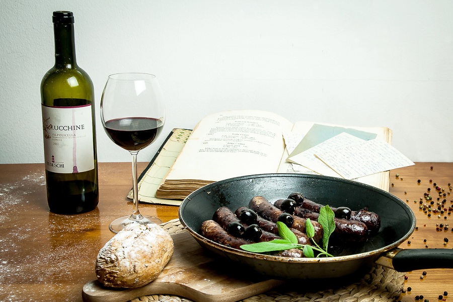 Najważniejszą częścią gotowania tej potrawy jest uduszenie białej kiełbasy w czerwonym winie. Wino nie może być zbyt intensywne w smaku. My dodaliśmy prostą Valpolicellę od Tedeschi, ale każde lekkie czerwone wino do 13% alkoholu z lekkimi taninami będzie odpowiednie.