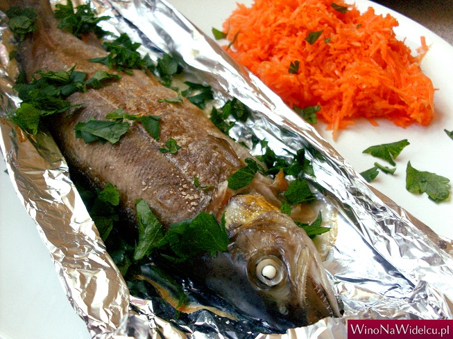 Pstrąg jako chuda i lekka ryba, wymaga wina lekkiego i świeżego (nie beczkowego). Wprost idealnie sprawdzają się wina, które posiadają dodatkową nutę przyprawową, pieprzową (np. Gruner Veltliner) lub przyjemne niuanse cytrusowe (np. Sauvignon Blanc). My wybraliśmy wytrawne wino hiszpańskie, zestawione ze szczepów Sauvignon Blanc i Moscatel. Podbudowane rześką, cytrusową kwasowością i kruchą strukturą, stanowiło doskonałą parę z subtelnym pieczonym pstrągiem.