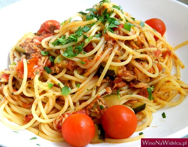 W tamtym roku gdy podczas degustacji win Iga przygotowała to spagetti, obecni tam Sycylijczycy zachwycili się makaronem twierdząc, że smakuje jak u Mammy... Tradycyjnie do tego spagetti nie używa się bazylii i sera. Zamiast bazylii dodatek stanowi pietruszka, a ja dla kolorystyki dodałem również odrobinę cukinii. Makaron, czosnek przesmażony na oliwie, pomidory, tuńczyk, cukinia i pietruszka. Proste danie, ale jakże wzbogaciło smak wina. Po pierwszych kęsach uwydatniła się nuta lekkiej pikantności wina, a subtelna goryczka migdałowa stanowiła harmonię z tuńczykiem.