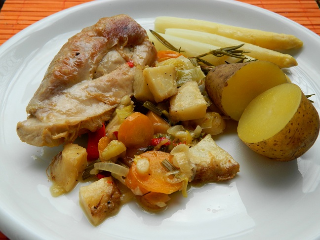 Comber (część krzyżową) z królika umyliśmy, osuszyliśmy i natarliśmy czosnkiem i oliwą. Odłożyliśmy do miski przykrywając gałązkami rozmarynu i pozostawiliśmy na 2 godziny w lodówce. W międzyczasie umyliśmy pęczek młodej włoszczyzny, pokroiliśmy go w plasterki i doprawiliśmy do smaku. Po dwóch godzinach wyjęliśmy królika z lodówki i obsmażyliśmy go z każdej strony na oliwie. Zarumienionego przykryliśmy warstwą warzyw i podlaliśmy odrobiną wody i wina. Gdy comber się dusił, wyszorowaliśmy młode ziemniaczki i obraliśmy pęczek szparagów. Ziemniaczki krótko pogotowaliśmy w lekko osolonej wodzie, a szparagi poddusiliśmy na klarowanym maśle z dodatkiem łyżeczki cukru, odrobiny soku z cytryny i mleka. Na wpół ugotowane ziemniaki podsmażyliśmy jeszcze na masełku aby zmiękły.