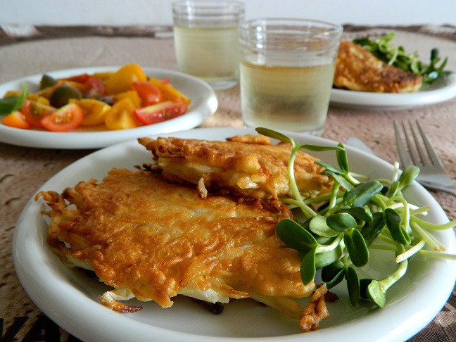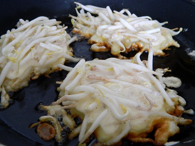 Zakupiliśmy kiełki fasolki mung oraz słonecznika... Były świeże, soczyste i chrupiące. Dały nam wiele witalności na początek dnia. Fasolkę umyliśmy i wmieszaliśmy w przygotowane wcześniej klasyczne ciasto naleśnikowe. Doprawiliśmy sola i pieprzem. Ciasta zrobiliśmy niewiele, aby fasolka stanowiła większość w potrawie. Tak przygotowane "placki" naleśnikowe podaliśmy z kiełkami słonecznika i mieszanką pomidorów koktajlowych.