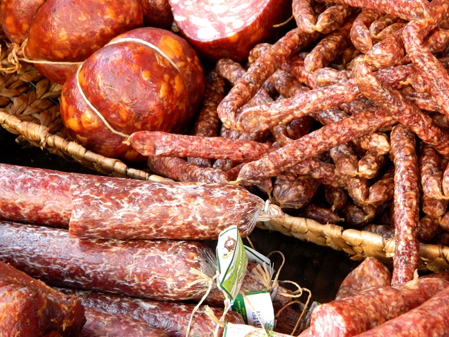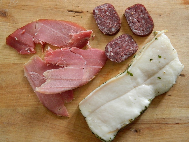 słonina w przyprawach, szynka gotowana, wędzona i kiełbasa z jelenia