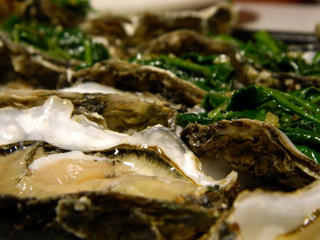 Ostrygi zapieczone z cebulką, czosnkiem, szpinakiem, serem grądzkim i bułką tartą.