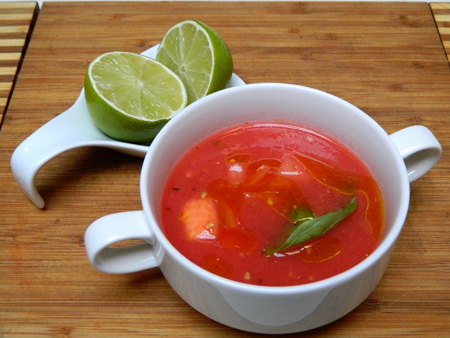 Chłodnik arbuzowo-pomidorowy z oliwą picual - komponował się z różowym urugwajskim winem (Muscat/Merlot).