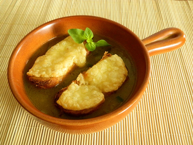 Zupę cebulową przygotowaliśmy w sposób następujący. Pięć dorodnych, białych cebul pokroiliśmy na półplasterki i dusiliśmy na oliwie tak długo aż się zezłociła. Następnie dodaliśmy dwa ząbki czosnku pokrojone na cienkie plasterki, a po chwili podsypaliśmy mąką i rozprowadziliśmy ją warzywnym bulionem. Podczas duszenia dolaliśmy pół szklanki białego półwytrawnego wina. Doprawiliśmy solą, pieprzem, odrobiną gałki muszkatołowej, rozmarynem i bazylią (sprawdza się też tymianek). Dzięki temu potrawa była nie tylko słodkawa dzięki podsmażonej białej cebuli, ale też nieziemsko pachniała przyprawami. Gdy zupa była już gotowa przygotowaliśmy grzanki. Opiekliśmy w piekarniku kromki chleba z plastrem sera koziego i położyliśmy je na podaną w miseczkach zupę.