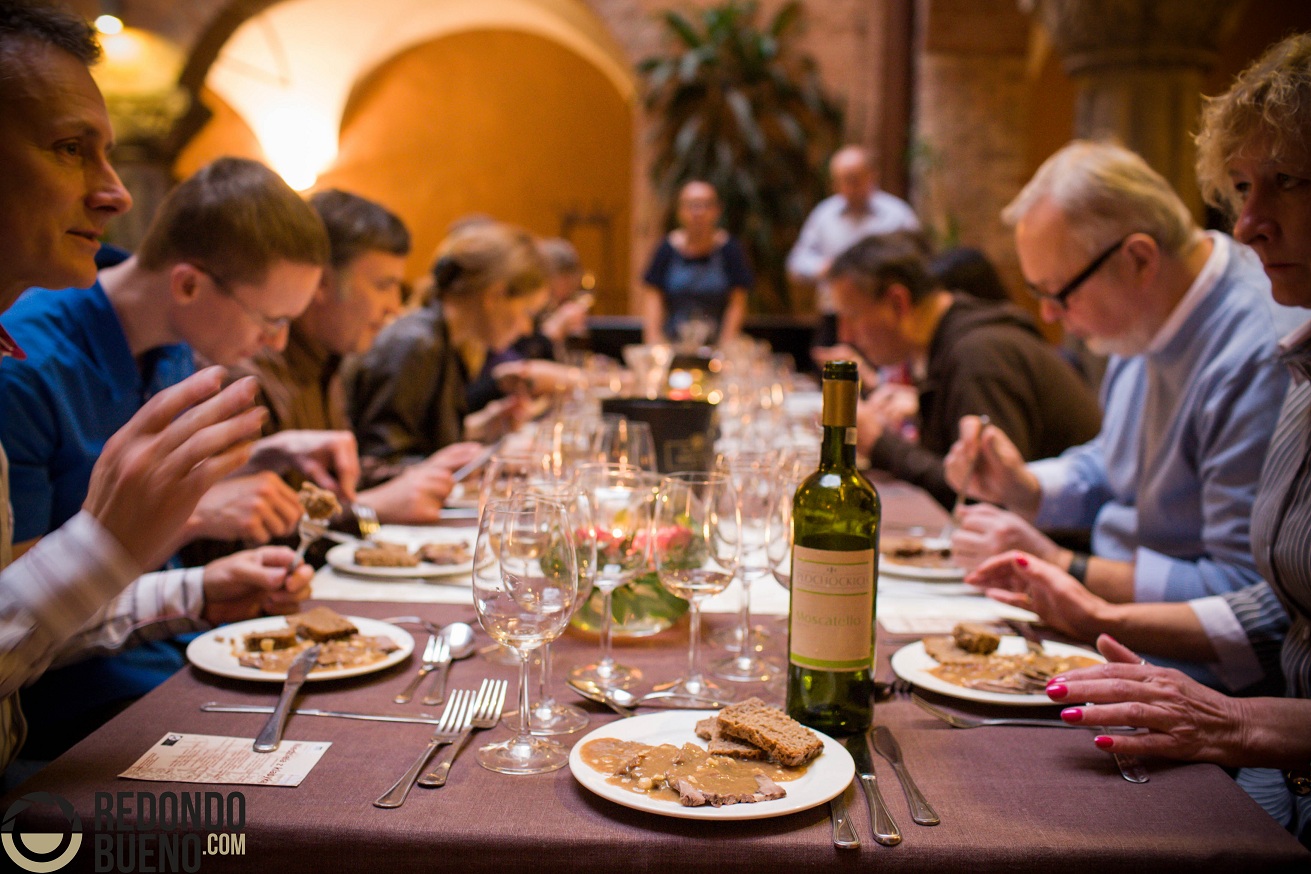 Kolejnym daniem, dla niektórych dość kontrowersyjnym, były ozorki wołowe w szarym sosie na bazie razowego chleba, miodu pitnego, migdałów, białego wina i rodzynek. Sos doprawiony imbirem, goździkami i gałką muszkatołową. Podsumowując, sos był słodko-kwaśno-korzenny. Do tej potrawy zostały podane dwa wina białe (pomimo że wołowina kojarzy się zazwyczaj z winem czerwonym). Jednym był polski Muscat, o korzenno-słodkim aromacie, ale wytrawny i lekko kwasowy. Drugim reński, półsłodki przedstawiciel szczepu Huxelrebe. Uczestnicy jednogłośnie stwierdzili, że do tej potrawy wino czerwone nie byłoby dobrym kompanem. Jednym bardziej z ozorkami komponował się wytrawny i aromatyczny Muscat, inni postawili na słodycz Huxelrebe. Sami też nie jesteśmy w stanie stwierdzić jednoznacznie, które z tych win lepiej pasowało do ozorków. Wydaje się, że idealny byłby półsłodki Muscat :)