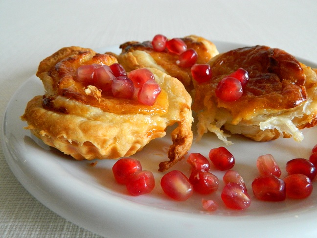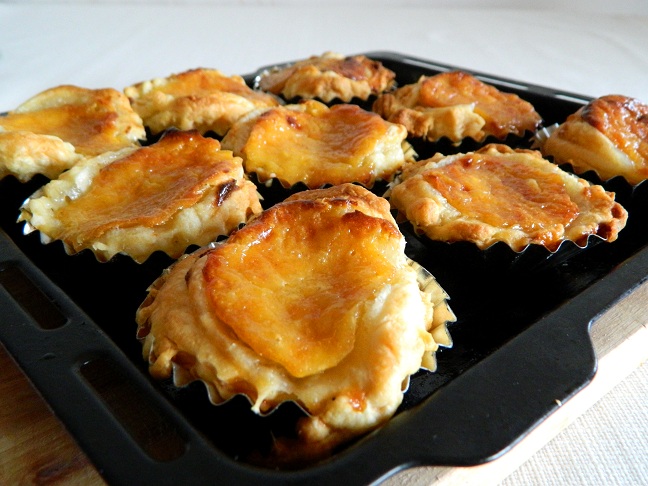 Jako że mamy sezon na te owoce, postanowiliśmy przygotować z nich karnawałowe ciasteczka. Owoce pokroiliśmy w talarki grubości 0,5 cm, odrzucając część przy ogonku, która utrzymuje najdłużej gorzki smak. Pokrojone owoce, obraliśmy ze skórki, a miąższ pokroiliśmy. Przy bardzo dojrzałych owocach kaki, miąższ może się nawet rozpłynąć po obraniu ze skórki. Owoce kaki stały się częścią pysznego kremu śmietankowo-budyniowego. Słodką śmietankę i mleko (w ilości po 125 ml) zagotowaliśmy z dodatkiem skórki z cytryny i dodaliśmy mąkę gotując budyń. Następnie przygotowaliśmy syrop, który dolaliśmy do budyniu (z 200 g cukru i 125 ml wody). Po lekkim ostudzeniu całości, dodaliśmy pięć żółtek i lekko zmiksowane kaki. Foremki do babeczek natłuściliśmy masłem i wylepiliśmy ciastem francuskim. Po napełnieniu kremem piekliśmy ok. 20 min w piekarniku nagrzanym do 220 stopni.