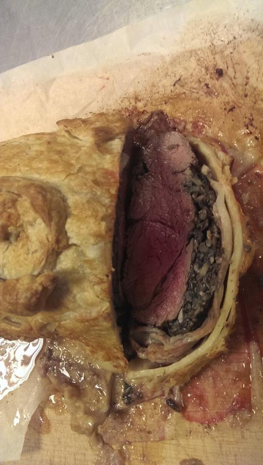 Podczas gdy mięso leżakuje w lodówce, nie należy tracić czasu. Można sięgnąć po kieliszek wina i usmażyć naleśniki. Na nich rozsmarować pasztet z gęsich wątróbek. Po wyciągnięciu mięsa z lodówki, odwijam je z folii, owijam je w naleśniki i oblepiam ciastem maślanym (bądź francuskim), smaruję roztrzepanym białkiem i piekę 15 minut w temperaturze 165 stopni. Po tym czasie wyjmuję mięso na 15 minut z piekarnika, odstawiam do ostygnięcia. Temperatura mięsa powinna być w okolicach 45 stopni. Po kwadransie całość jeszcze raz wprowadzam do piekarnika, tym razem piekę je max 10 minut w temperaturze 210 stopni. Mięso po wyciągnięciu powinno mieć około 59 stopni.