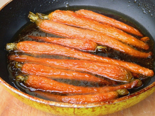 Żeby podkręcić jeszcze marchewkowy charakter ciasta, podaliśmy do niego przygotowane przez Igę marchewki, karmelizowane w miodzie z dodatkiem oliwy (tej samej co jest w cieście) i soku z cytryny. Umyte i obrane surowe, młode marchewki Iga poddusiła w wyżej wymienionych składnikach. Marchewki dusiły się na małym ogniu, dzięki czemu nie potrzebowała dodawać wody (marchewki puściły sok).