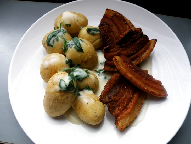 Tradycyjnym dodatkiem do Stegt flæsk są ziemniaczki i sos pietruszkowy. Użyłem młodych ziemniaczków i ugotowałem je w mundurkach. Osobiście lubię tę potrawę z dodatkiem sosu beszamelowego, a dopiero następnie całość posypuję posiekaną natką pietruszki.