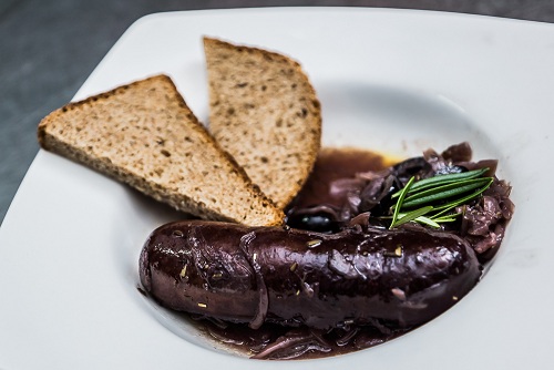 Biała kiełbasa w czerwonym winie, serwowana z winem Tedeschi Valpolicella Classico