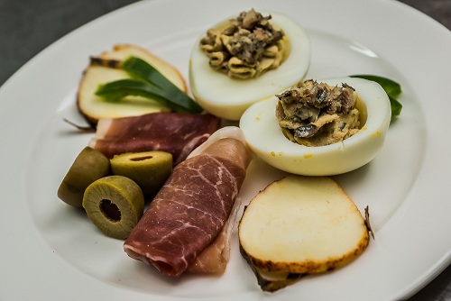 przekaski (ser gradzki, szynka serrano, jajko faszerowane sardynkami i oliwki), serwowane z winem Fino Electrico od Bodegas Toro Albala