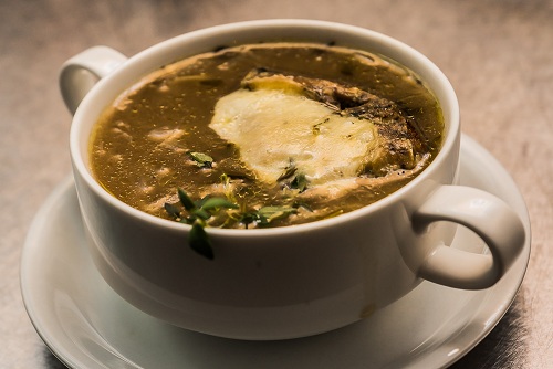 Zupa cebulowa z grzanka z serem gradzkim, serwowana z winem Boeckel Gewurztraminer