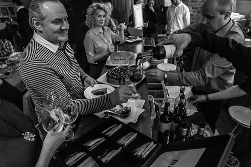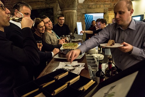 Podczas after-party podaliśmy urodzinowe torty... mięsne torty. Jeden był z mięsa wołowo-wieprzowego z dodatkiem wątróbki i galaretki z czerwonego wina oraz czerwonych winogron, drugi z mięsa tuńczyka z galaretką z białego wina i białymi winogronami. Każdy mógł ich spróbować oraz zamówić kieliszek białego lub czerwonego wina. Oczywiście odpowiednio dobranego.