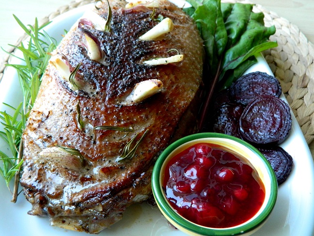 Po dłuższym zastanowieniu stwierdziliśmy, że najlepszym połączeniem kulinarnym będzie potrawa prosta, ale niebanalna - bo takie też jest wino ze szczepu Rondo. Dziczyzna, którą polecają do Rondo w innych polskich winnicach, naszym zdaniem jest propozycją zbyt ogólną. Dzik będzie zbyt intensywny, ale zając czy sarnina mogłyby skorzystać w połączeniu z winem ze szczepu Rondo. My natomiast rozejrzeliśmy się po okolicy w poszukiwaniu kompana dla wina, zgodnie z tezą, że wino najlepsze jest z lokalnym jedzeniem. Niedaleko Słupska, w Swołowie, przyrządza się niesamowitą gęsinę. Będąc tam spróbujcie jej (co roku 11 listopada odbywa się tam święto bicia gęsi - zapraszamy!). Mamy niestety czerwiec, a nie listopad i w związku z kalendarzem musieliśmy sięgnąć po gęś mrożoną, którą upiekliśmy. Pierś z gęsi pieczona w żurawinie i z akompaniamentem buraczków stanowiła idealną parę dla Rondo z Winnicy Anna de Croy. Kompozycja leśnych owoców i buraczków stanowiła przedłużenie smaków leśnych owoców w winie.