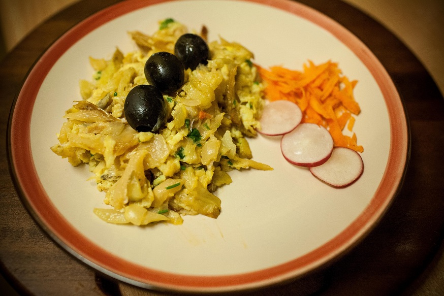 Dzięki temu, że udało nam się zdobyć wysokiej jakości bacalhau, mogliśmy przygotować nie tylko sałatkę, ale też kolejną potrawę - bacalhau a bras. Jest to suszony solony dorsz, namoczony i ugotowany, a następnie podany z pokrojonymi w zapałkę ziemniakami, cebulą, czosnkiem, wymieszany z jajkami oraz z dodatkiem czarnych oliwek. Mimo różnic kulturowych, w wielu regionach świata ludzie jedzą jajecznicę i dorzucają do niej to co jest w pobliżu. W Polsce dajemy boczek, kurki, szynkę, pomidory itp., a w Portugalii dodają bacalhau i czarne oliwki (Portugalczycy jedzą tę potrawę na lunch lub obiad). Do bacalhau a bras podaliśmy białe wino z żywą kwasowością, niezłą strukturą oraz delikatnie kwiatowymi akcentami. Santa Vitoria Versatil, stworzone z Arinto, Antao Vaz i Viosinho było regionalnym winem z Alentejo. Kwasowość pomogła ożywić potrawę składającą się z jajek, a kombinacja kwasowości i struktury współgrała świetnie z bacalhau i oliwkami.