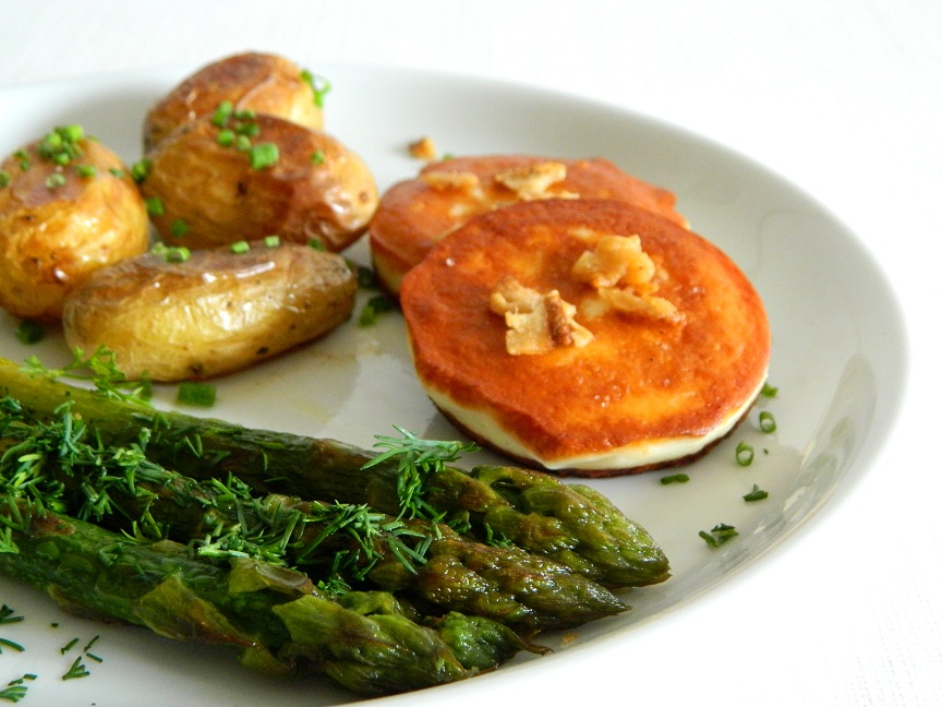 Nasza potrawa składała się z samych polskich składników: ser wołoski z Podkarpacia, szparagi i młode ziemniaczki z wielkopolskiich plantacji, polska słonina, jak również "polskie zioła", czyli szczypiorek i koperek. Upieczone młode ziemniaczki w koszulkach, grillowane na odrobinie klarowanego masła szparagi i grillowany kozi ser, a wszystko posypane szczypiorkiem, koperkiem i chipsami ze słoniny (pokrojonej w cienkie paski, wytopionej na chrupko na patelni) skomponowały się bezbłędnie z polskim winem. Mało tego Winnica Srebrna Góra usytuowana w obrębie miasta Krakowa to niedaleko miejsca pochodzenia głównego składnika potrawy - sera wołoskiego. Kwasowość wina i szparagi oraz delikatny cukier resztkowy i aksamitna słoność sera to dwa czynniki gwarantujące powodzenie tego połączenia. Teraz już wiemy, że na wysokiej jakości smażony ser nie musimy jechać do Czech lub na Słowację - możemy go przygotować z polskiego sera wołoskiego. Na ciepło jest on najlepszy!