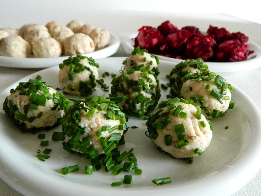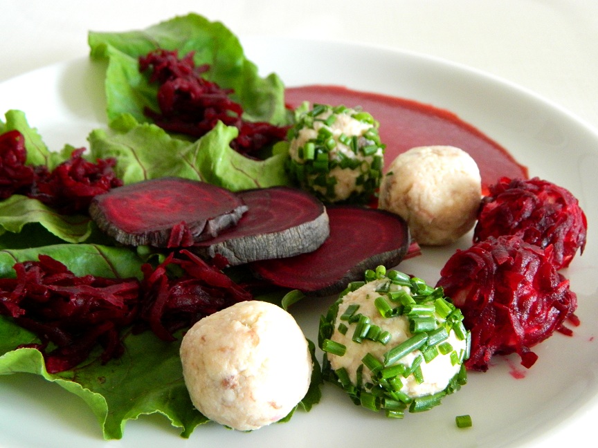 "Polecieliśmy w kulki". Starty owczy bundz wymieszaliśmy z obraną wędzoną makrelą i przyprawiliśmy odrobiną startego chrzanu. Z aromatycznej serowo-rybnej masy uformowaliśmy kuleczki i podzieliliśmy na trzy części - 1/3 otoczyliśmy w szczypiorku, 1/3 w startym, pieczonym młodym buraku, a 1/3 zostawiliśmy bez otoczki. Potrawę podaliśmy na liściach botwinki z pieczonym młodym burakiem w plastrach i sosem malinowym sporządzonym z malin, oliwy, gruszkowego balsamico i odrobiny miodu. Sos przetarliśmy przez gęste sito, aby pozbyć się pestek.