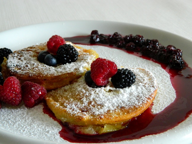 Do tego słodkiego wina, przygotowaliśmy potrawę z wykorzystaniem skarbów lata. Oczywiście na słodko. Potrawa ta zwana w domu rodzinnym Igi oładkami jest równie prosta co smaczna. Duże, kruche, słodko-winne jabłka, najlepiej antonówki, pokroiliśmy na plastry grubości ok 1,5 cm, usunęliśmy gniazda nasienne i lekko pokropiliśmy cytryną aby nie ściemniały. Z przesianej mąki, jaj i mleka sporządziliśmy ciasto o konsystencji gęstej śmietany. Krążki jabłek otoczone ciastem usmażyliśmy na oliwie z dodatkiem klarowanego masła. Oładki podaliśmy z sosem z malin, jeżyn i borówek sporządzonym w następujący sposób: owoce w równych częściach zasypaliśmy cukrem i kiedy puściły sok zalaliśmy czerwonym winem Aleatico i szybko zredukowaliśmy.