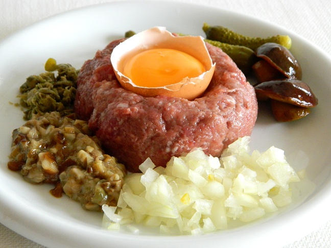 My przygotowaliśmy dziś tatar z gęsiny :) tak, tak, ze świeżej piersi gęsiej. Jada się takowego na Kaszubach i Iga, która próbowała go kiedyś przypomniała sobie jego smak. Udała się na poznański Rynek Jeżycki, (gdzie gęsinę oferują porcjowaną) i kupiła świeżutką gęsią pierś, którą po obcięciu nadmiaru tłuszczu (jak wiadomo gęś to najtłustszy drób) pieczołowicie zmieliła wraz ze skórką. Dodatki były klasyczne: posiekane grzybki marynowane, korniszony, cebulka i dodatkowo odrobina kaparów, oczywiście żółtko i sól i pieprz do smaku. Tatar smakował wyśmienicie, mięso było tłuste o kremowej konsystencji, zupełnie inne jak tatar z wołowiny czy koniny, delikatne ale o specyficznym smaku. Należy dodać, że mięso gęsie jest też bardziej aromatyczne.