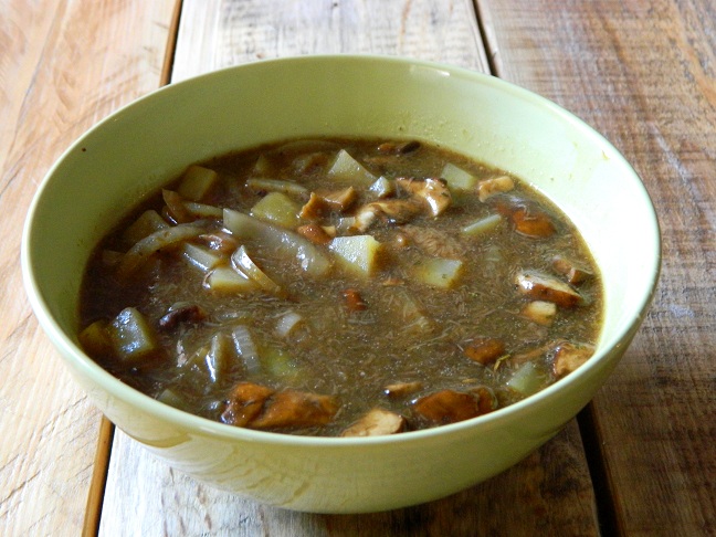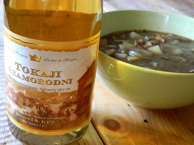 5. Na koniec przyszedł czas na zupę, którą Iga nazywa galicyjską. To bardzo prosta zupa z grzybów (podgrzybki) z dodatkiem ziemniaków, cebuli i czosnku oraz mieszanki suszonych ziół. Zupa jest bardzo gęsta, wręcz kleista ze względu na świeże grzyby oraz bardzo aromatyczna, ziołowa. Sporo pieprzu sprawiło, że potrawa jest jeszcze bardziej rozgrzewająca. Maciej zastanawiał się kilka tygodni jakie wino podać do tej zupy. Ostatecznie wybór padł na 11-letniego słodkiego Tokaja Szamorodni. W pierwszej chwili mogłoby się wydawać, że to dziwaczne połączenie, natomiast trzeba w tym miejscu zaznaczyć, że dojrzałe słodkie Tokaje mają w zwyczają "gubić" swoją owocowość, na rzecz nut grzybowych. Okazało się, że lepka od słodyczy konsystencja wina, idealnie pasowała do kleistości zupy, a słodycz zneutralizowała jej pikantność. Kompozycja była najbardziej eksperymentalna i kontrowersyjna, ale okazało się że trafiona w punkt.