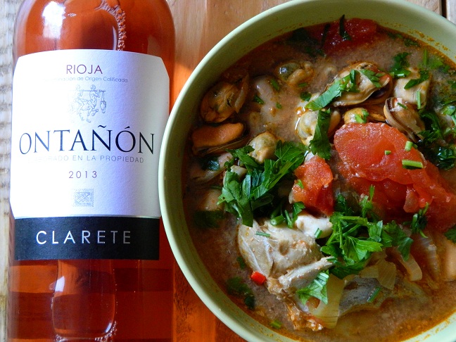 2. Zupa benedyktyńska z owocami morza (kalmarami, mulami i świeżym dorszem) na wywarze rybnym, z białym winem, pomidorami, czosnkiem i ostrą papryczką. Kompozycja z nietypowym różowym winem z hiszpańskiego regionu Rioja wypadła bardzo dobrze. Ciekawostką jest fakt, że wino powstało poprzez wspólną macerację białych gron Viura i czerwonych Tempranillo.