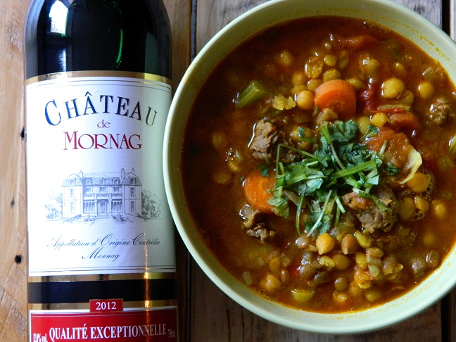 4. Był już chłodnik były owoce morza i owoce, więc nie mogło zabraknąć zupy z mięsem. Gęsta i aromatyczna, marokańska zupa "harira", z dużą ilością wołowiny z grochem, cieciorką, soczewicą i warzywami. Ważnym elementem tej zupy była też pikantność uzyskana przez dodanie harissy i mieszanki marokańskich przypraw. Do wołowiny i pikantnych potraw potrzebowaliśmy czerwonego wina z niską taniną, ale podwyższonym cukrem. Zdecydowaliśmy się na tunezyjskie wino z apelacji Mornag, w którym producent pozostawił naturalny cukier resztkowy, kosztem niewielkiej ilości alkoholu. Wino samo w sobie średniej jakości, ale w połączeniu z potrawą zmieniło się diametralnie.