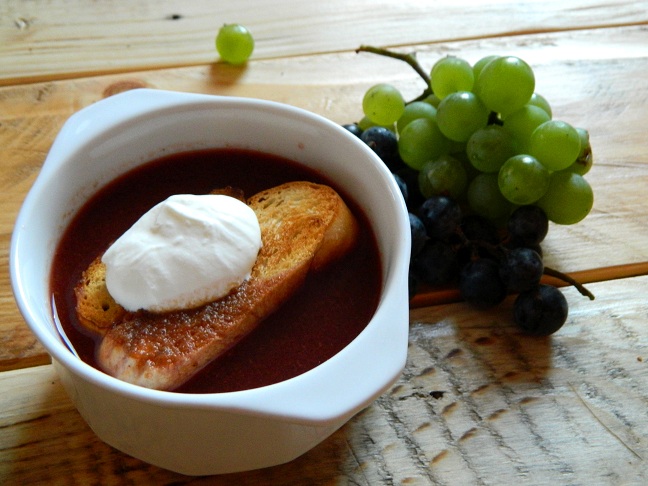 3. Ze staropolskiej kuchni wybraliśmy zupę śliwkową z przejrzałych węgierek, uduszonych w czerwonym winie z dodatkiem cynamonu, imbiru i goździków, podaną z niesłodką bitą śmietaną i grzankami ze słodkiej chałki. Odrobina miodu dodanego do zupy delikatnie zachwiała równowagę pomiędzy zupą a wytrawnym czerwonym winem, które podaliśmy. Wino z apelacji Campo de Borja to 100% Syrah joven (młody), było soczyście śliwkowe i do wytrawniejszej wersji zupy pasowałoby dużo lepiej. Aczkolwiek koncepcja była ciekawa i spotkała się z pozytywnymi reakcjami gości.