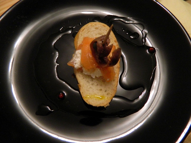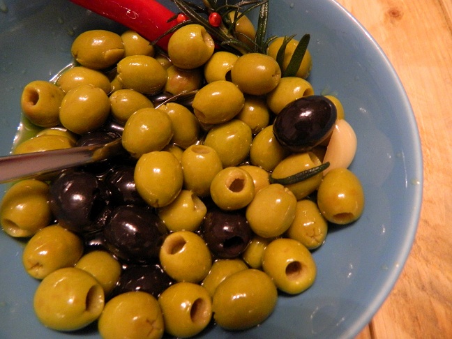 1. Pintxos (przekąski): Oliwki marynowane w oliwie z dodatkiem chili, czosnku, rozmarynu, różowego pieprzu i skórki cytrynowej; łosoś wędzony z serkiem kremowym i anchovies na bagietce; papryczki maryniowane.