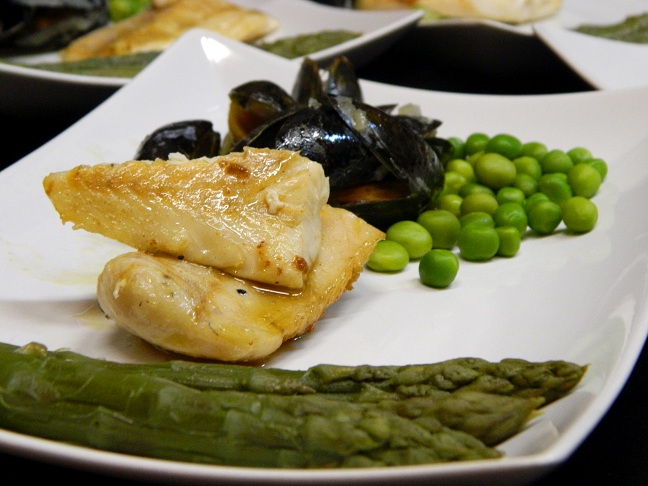 2. Merluza a la koskera (morszczuk w białym winie z małżami, szparagami i zielonym groszkiem).