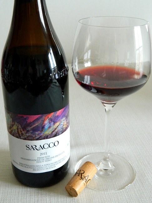 My wybraliśmy Saracco Pinot Noir 2011, nietypowo z Piemontu. Nietypowo, ponieważ szczep ten nie jest jednym z ważniejszych odmian tego regionu. Nietypowo również dlatego, że Pinot pochodzi od producenta słynącego z wytwarzania słodkiego Moscato d'Asti. Wino spełniało kryteria przedstawione powyżej - nie posiadało zbyt wysokiej kwasowości, ani taniny (w końcu to Pinot), a nawet wysoki alkohol, jak na tę odmianę (14%), nie przeszkadzał przy połączeniu. Dzięki niezłej cielistości, wpasowało się idealnie w kompozycję ze strogonowem.