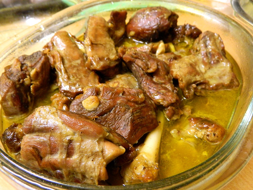 Podaliśmy również dwie potrawy z koziny, która jest bodaj najczęściej podawanym mięsem w południowo-wschodniej Hiszpanii. Zdobycie koziny w Polsce nie należy do łatwych, ale od czego ma się przyjaciół. Marek Grądzki znany serowar i specjalista od kozich serów, dostarczył nam koziołka, a przyjaciele Igi z Pintej Klepki pomogli w jego porcjowaniu. Powstały dwie potrawy. Pierwsza to esencjonalny bulion z okazałym pulpetem, serwowany w Murcii jako zupa wzmacniająca (na kaca?). Obowiązkowo należało do niego wcisnąć bezpośrednio do talerza sok z połówki cytryny. Do tej zupy Maciej zaproponował (dość kontrowersyjnie) czerwone wino Luzon ze szczepów Monastrell/Cabernet Sauvignon z D.O. Jumilla (apelacja z okręgu Murcia), które dojrzewało 12 miesięcy w amerykańskim i francuskim dębie. Kto by pomyślał, że do zupy będzie pasować intensywne czerwone wino? Rosół był intensywny, korzenny i bardzo mięsny, a do tego pulpet w środku nadawał jeszcze więcej charakteru potrawie. Dzięki wciśnięciu soku z cytryny do zupy, w winie ukazała się większa świeżość i soczystość, a nawet kwasowość Caberneta.
