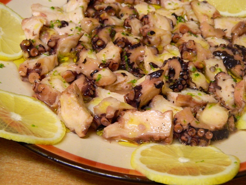 Drugą przystawką była ośmiornica w białym winie przygotowana na sposób zaobserwowany w Murcii. Przygotowanie dania jest dosyć czasochłonne, warto jednak poświęcić kilka chwil, by zapoznać się z tym smakiem! Świeża ośmiornica po oczyszczeniu została dokładnie zbita drewnianą pałką aby zmiękła, a następnie, według hiszpańskich podpowiedzi, została "przestraszona", czyli kilkukrotnie zanurzona na pięć sekund we wrzątku. Po obiciu i "nastraszeniu" ośmiornica została zamarynowana w białym winie, oliwie i czosnku, a potem dusiła się ok. godziny bez dodawania wody (czas duszenia zależy od wielkości ośmiornicy i wymaga wyczucia). Przystawkę podaliśmy na zimno, skrapiając ośmiornicę sokiem z limonki i posypując otartą skórką.