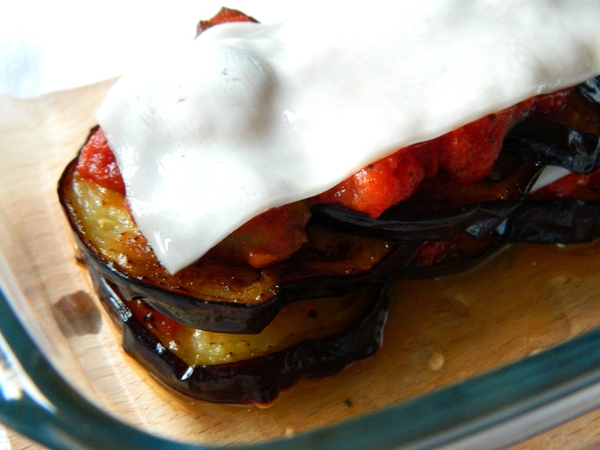 Pokrojonego na plastry bakłażana posoliliśmy i po 15 minutach odsączyliśmy z nadmiaru soku. Następnie go zgrillowaliśmy i przełożyliśmy pomidorami (puszkę pomidorów dusiliśmy na oliwie, redukując o połowę, doprawiając solą, pieprzem i dodając pokrojone na połówki czarne i zielone oliwki). w żaroodpornym naczyniu ułożyliśmy warstwę bakłażanów, na nich pomidory, kozi ser, po tym kolejną warstwę i zakończyliśmy bakłażanem i serem. Potrawę zapiekaliśmy 20 min. w piekarniku nagrzanym do 200 stopni. Grillowany bakłażan jest mięsisty, a pomidory dodały kwasowości. Najlepszym winem do tej potrawy okazał się Monastrell, który był winem najświeższym, najbardziej soczystym. Ani wino, ani potrawa nie dominowały. Połączenie bez zarzutu, chociaż bez efektu "wow".