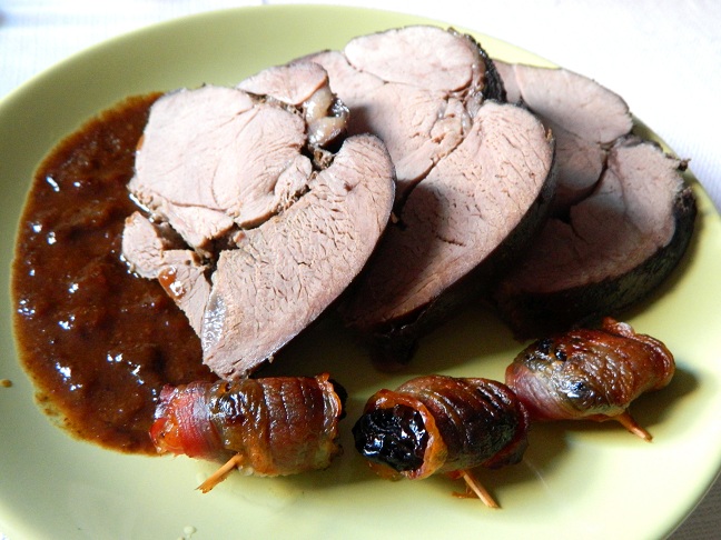 Szynkę marynowaliśmy całą noc w czerwonym winie i oliwie, z dodatkiem jałowca, czosnku, liścia laurowego, ziela angielskiego. Następnie piekliśmy 4 godziny w piekarniku nagrzanym do 170 stopni, stopniowo zminiejszając temperaturę i polewając pozostałą marynatą. Gdy mięso odpoczywało, zredukowaliśy powstały podczas pieczenia sos i doprawiliśmy go powidłami śliwkowymi bez dodatku cukru (które usmażyła Iga). Na koniec do sosu została dodana łyżka zimnego masła, aby sos zyskał aksamitną konsystencję. Sarninę podaliśmy z sosem i śliwkami wędzonymi zawiniętymi z boczek.