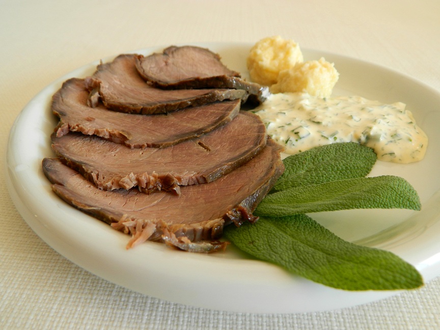 Do potraw ciepłych, często pieczonych mięs w rozmaitych sosach, dobór win zależy właśnie od sosów. Najczęściej spotykane to sos pieczeniowy ciemny i jasny śmietanowy. Do tego pierwszego polecamy na przykład soczyste i owocowe Cotes du Rhone, Chianti Classico lub jakościowa Kadarkę. Jeśli nie ma sosu, należy zwrócić uwagę na dodatki i charakter mięsa.