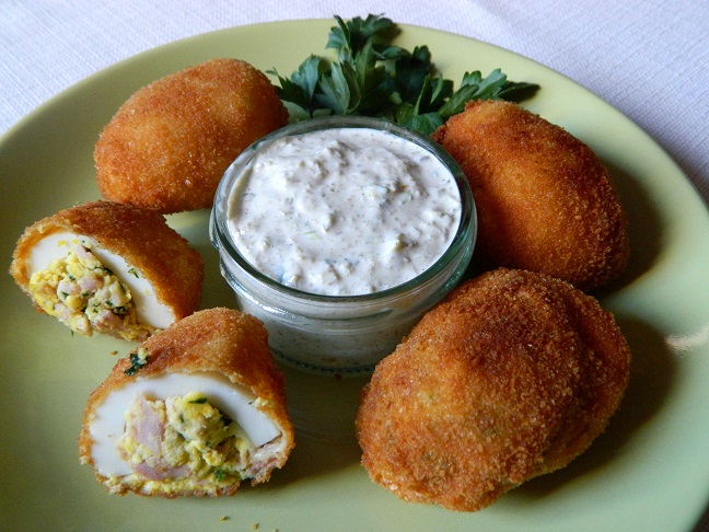 Przykład: Faszerowane jajka, usmażone w panierce (według portugalskiego przepisu) i podane z sosem tatarskim + Muller Thurgau musujace (metoda Charmata).