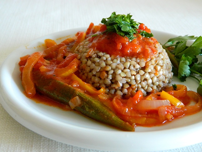 Postanowiliśmy zrobić okrę po grecku - w pomidorach.Na patelni rozgrzaliśmy oliwę. Pokrojone w piórka cebulę i żółtą paprykę oraz trzy posiekane ząbki czosnku zeszkliliśmy nie dopuszczając do zezłocenia. Umytą i osuszoną okrę, po odcięciu ogonków i lekkim nacięciu, dołożyliśmy na patelnię. Doprawiliśmy morską solą, świeżo tłuczonymi ziarnami czarnego pieprzu i kolendry. Dusiliśmy ok. 10 minut.Po koniec gotowania dołożyliśmy puszkę dobrych pomidorów. Sos naturalnie zgęstniał dzięki delikatnej lepkości okry. Gotowe danie posypaliśmy natką pietruszki i podaliśmy z kaszą krakowską, czyli z kaszą gryczaną nie paloną prosto z krakowskiego Starego Kleparza.